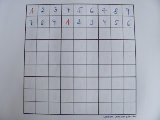 Damit sich im mittleren Teil des Sudokus nicht alles wiederholt, versetzen wir unsere Zahlenabfolge jetzt um eine Position nach rechts (siehe Bild rechts).