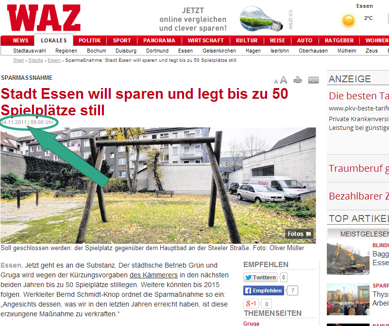 Konkret geht es mir um einen Beitrag aus der heutigen WDR Lokalzeit Ruhr: darin wird über die Entscheidung der Stadt Essen berichtet, in den nächsten Jahren 50 Kinderspielplätze, also etwa zehn Prozent aller Spielplätze der Stadt, zu schließen (zum Beitrag klickt bitte hier – die ersten 30 Sekunden zählen NICHT zum Beitrag).